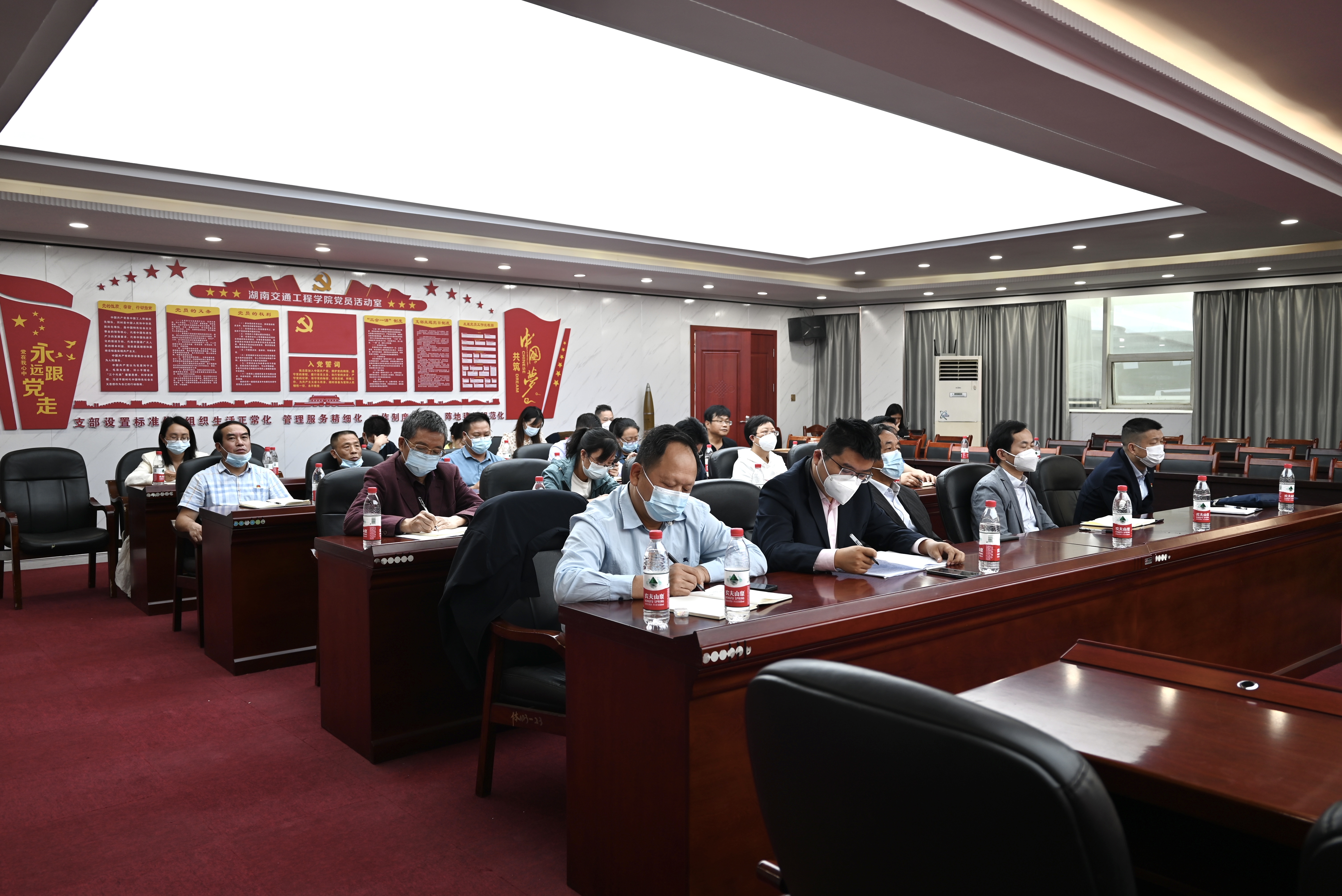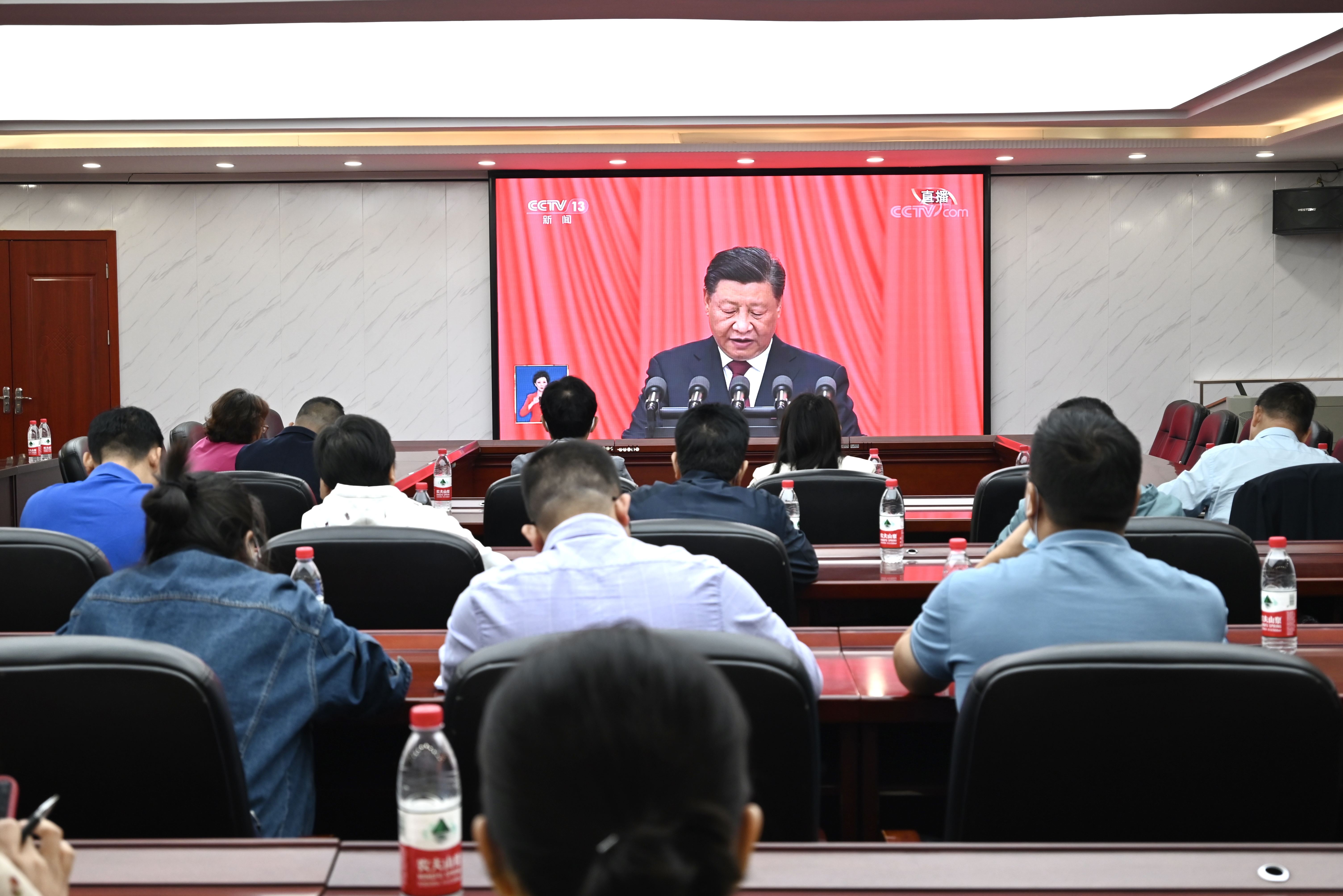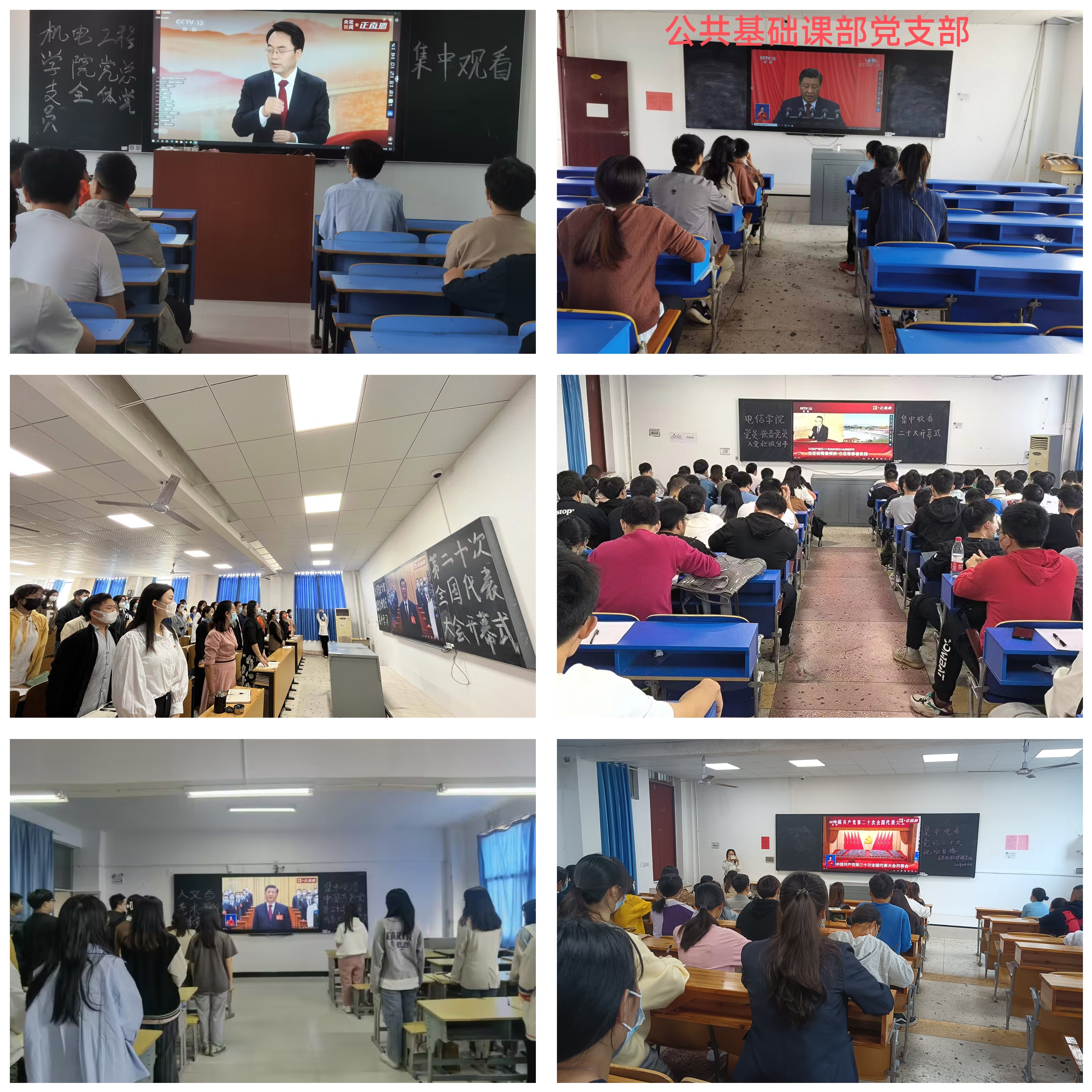 10月16日上午10时,党的二十大在北京隆重开幕。校党委委员、校领导、党务部门负责人、各二级党总支(直属党支部)书记在体育馆103会议室集中收看中国共产党第二十次全国代表大会开幕会直播盛况;下属9个党总支(直属党支部)分别在各自党员活动室组织各支部教工党员集中收看;6个二级学院学生党支部在各自多媒体教室组织观看;其他师生纷纷通过广播、电视、网络等多种形式组织收听收看。