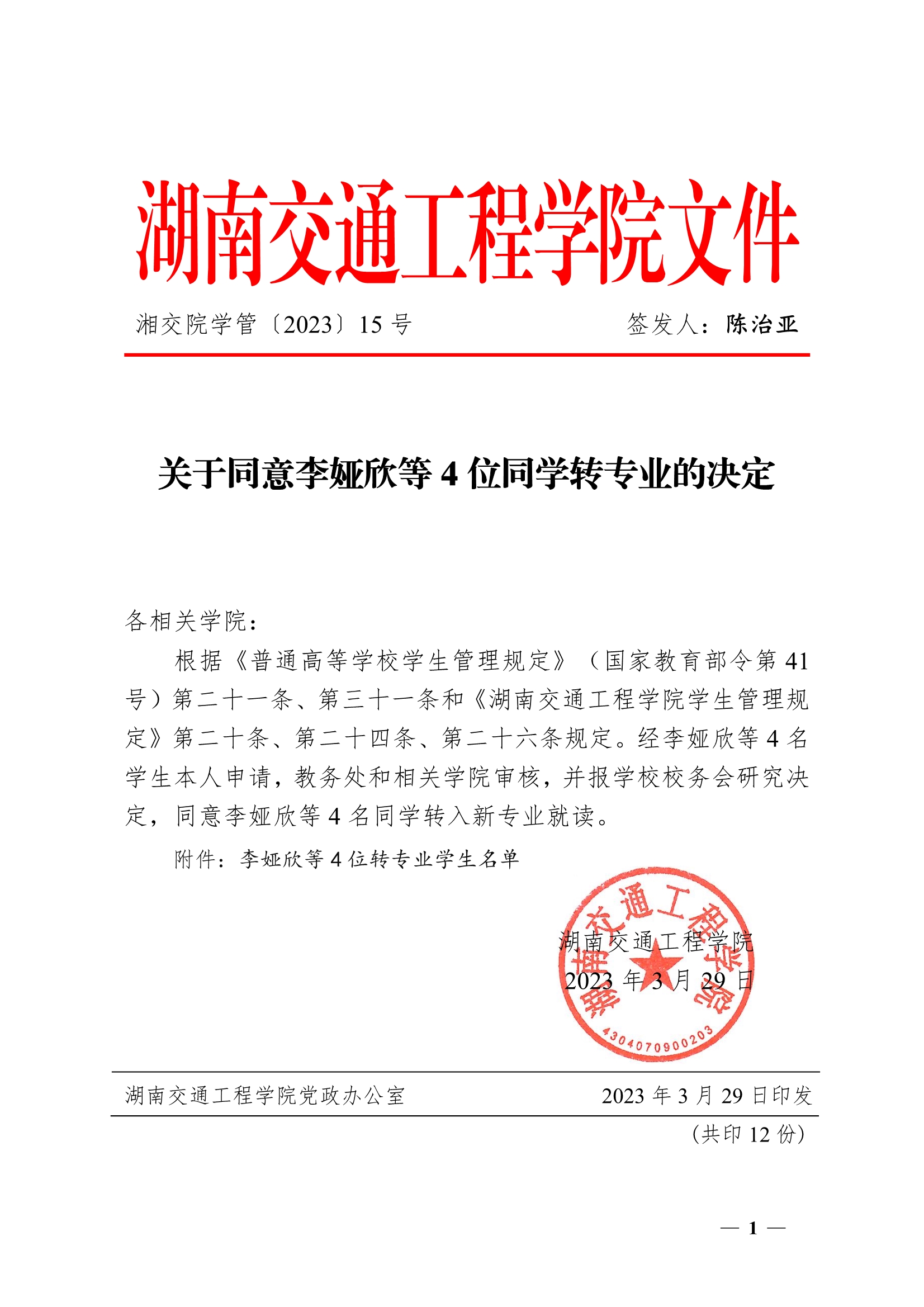 关于同意李娅欣等4位同学转专业的决定(湘交院学管〔2023〕15号)