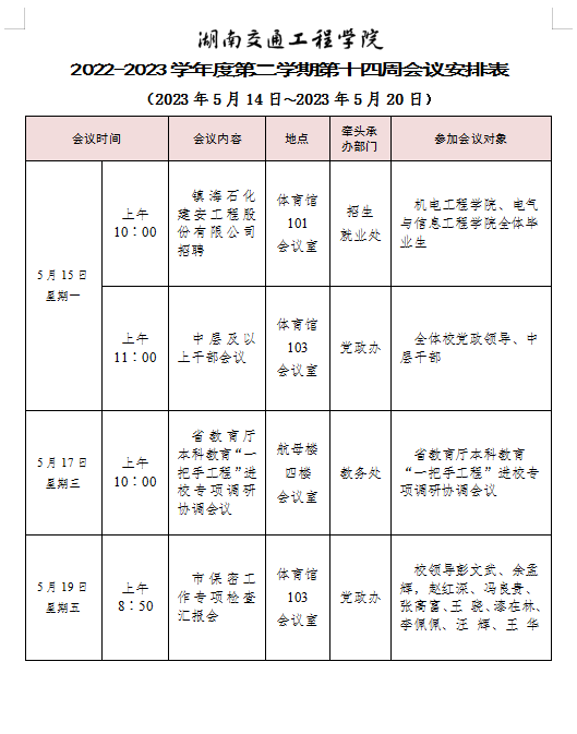 beat365唯一官方网站2022-2023学年度第二学期第十四周会议安排表