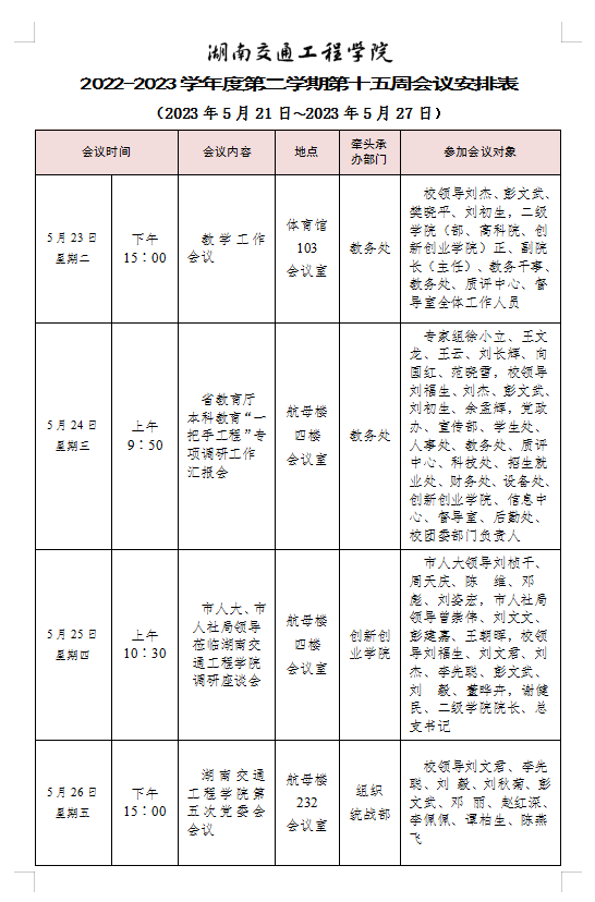 beat365唯一官方网站2022-2023学年度第二学期第十五周会议安排表