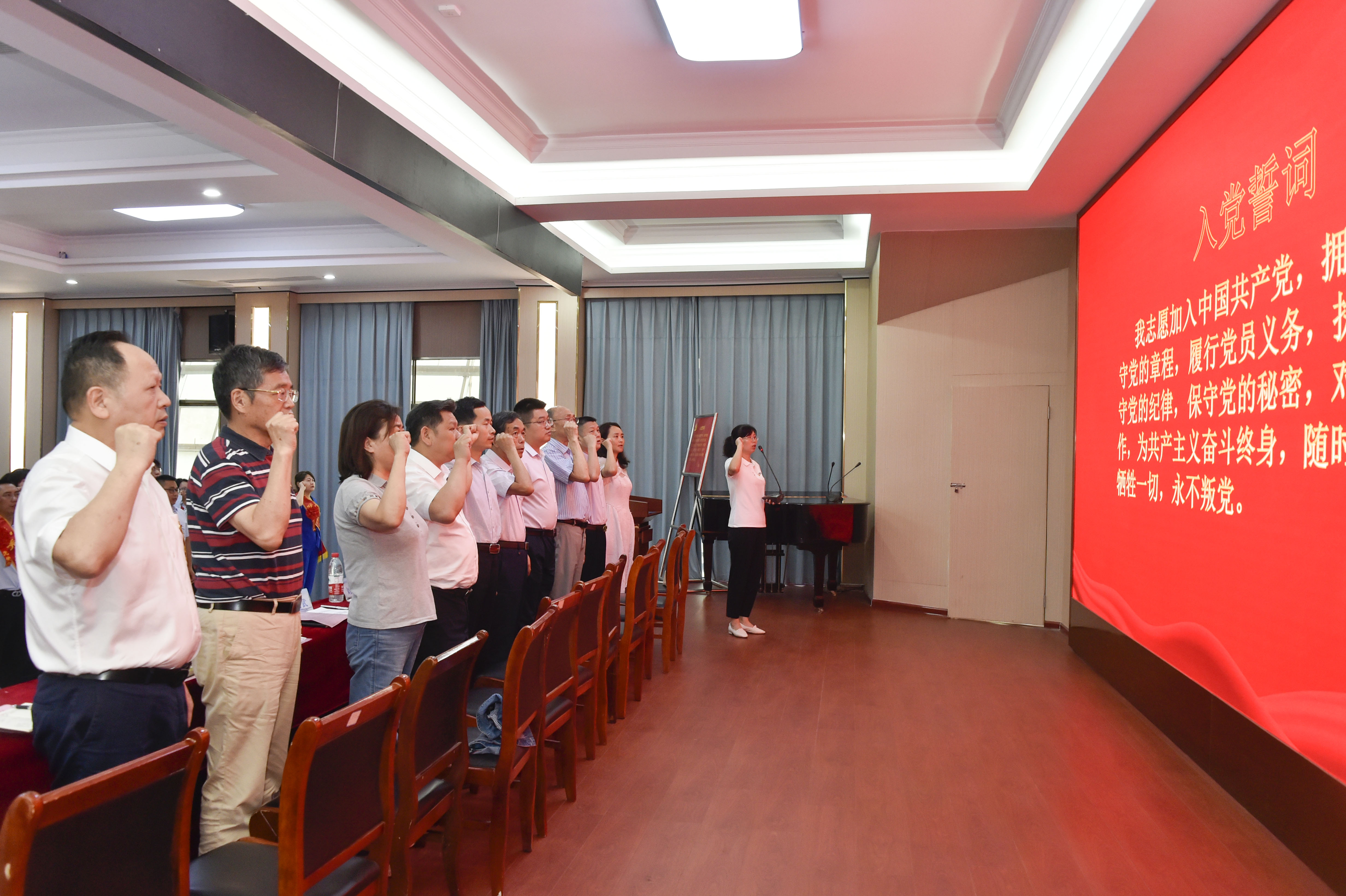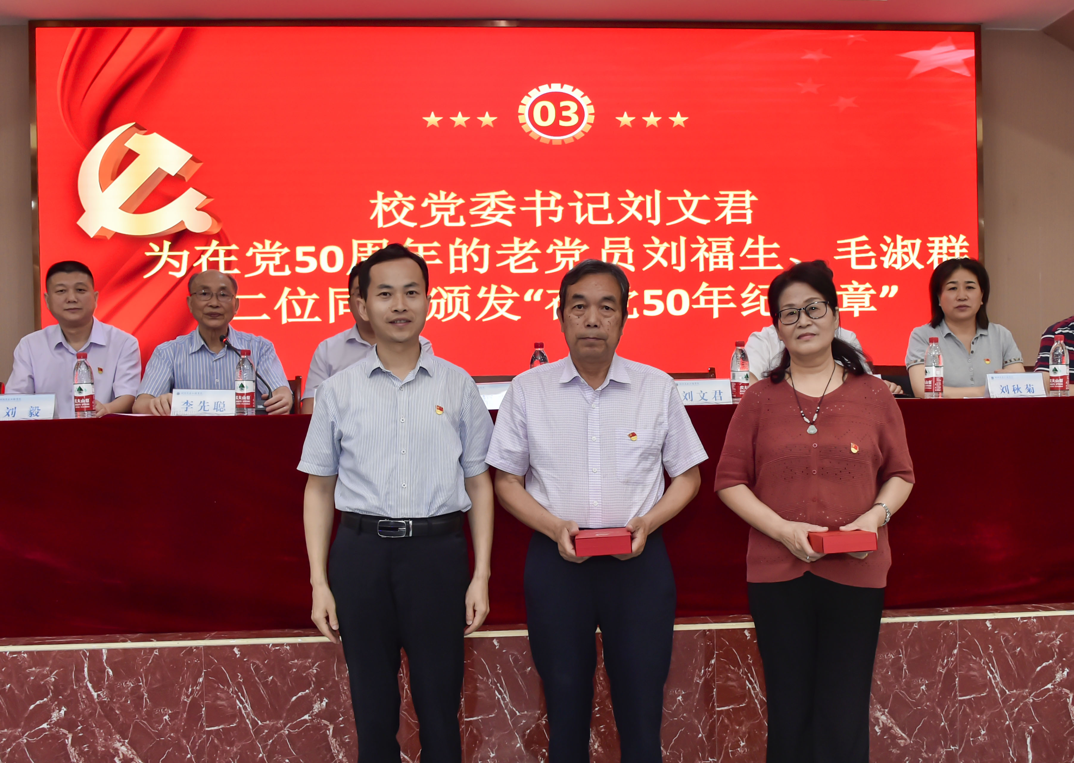 伴随着庄严的国歌声,学校庆祝建党102周年暨“七一”表彰大会正式开始。首先,新党员面向党旗庄严宣誓、老党员重温入党誓词。刘文君向老党员刘福生、毛淑群颁发在党50周年纪念章,向他们多年来为学校发展所做的贡献致以崇高的敬意和诚挚的慰问。