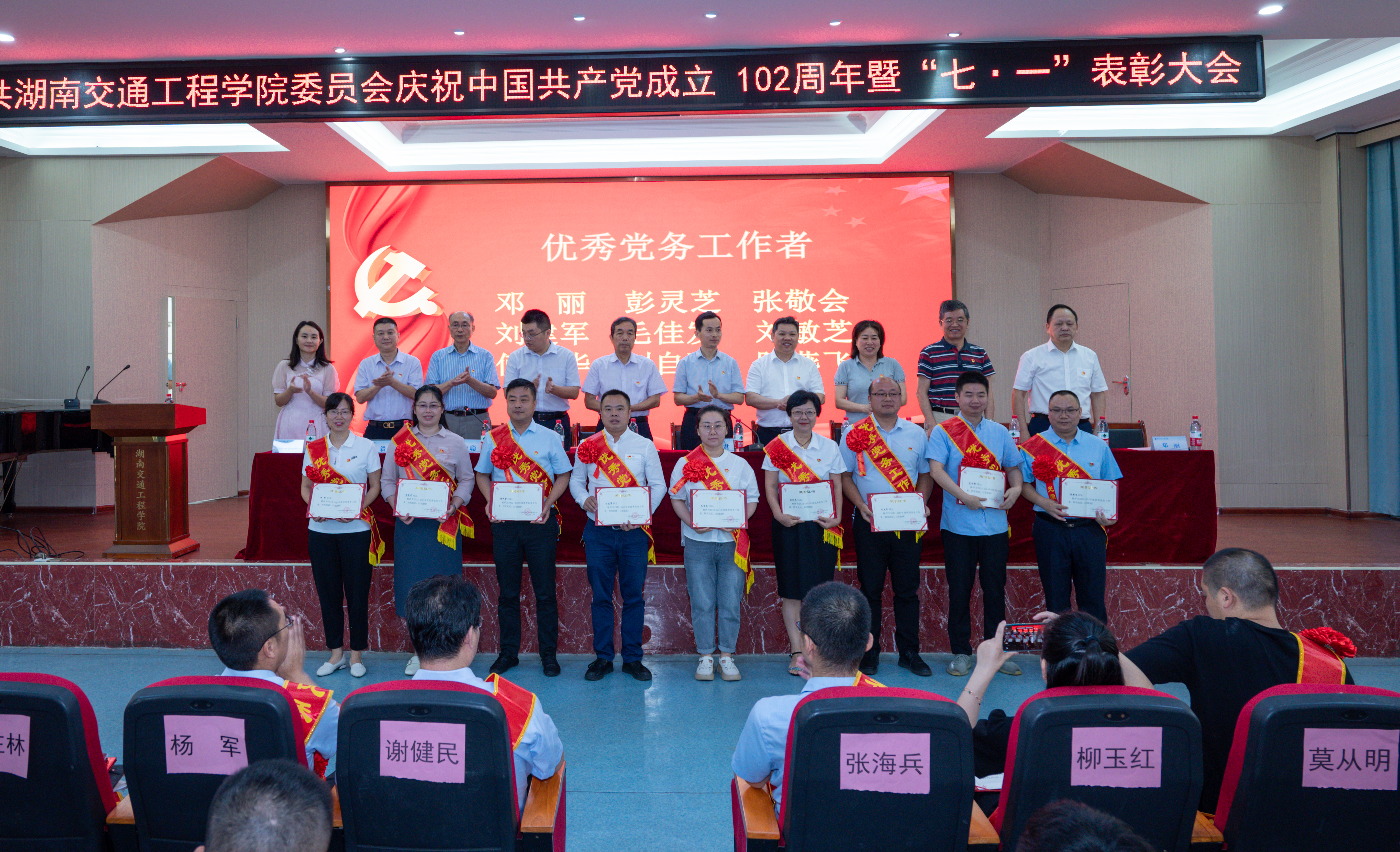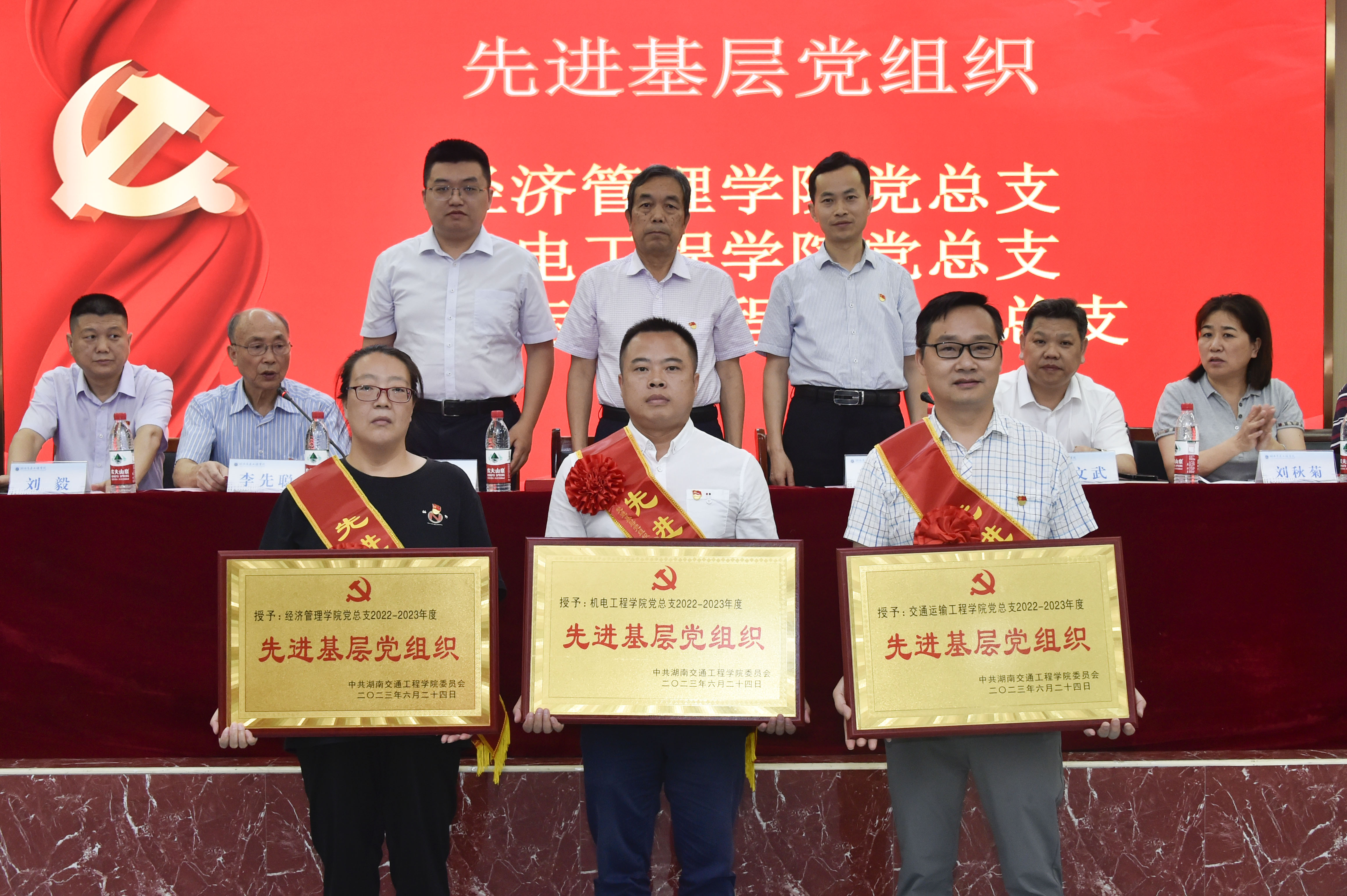 彭文武宣读了学校《关于表彰2022-2023年度“七一”表彰的决定》。表彰了经济管理学院党总支等3个“先进基层党组织”,刘敏芝等9位“优秀党务工作者”,霍志玮等56位“优秀共产党员”,赵荣华等24位“优秀通讯员”。参会校领导分别为获得表彰的个人、集体进行了颁奖并合影,会场响起热烈掌声。