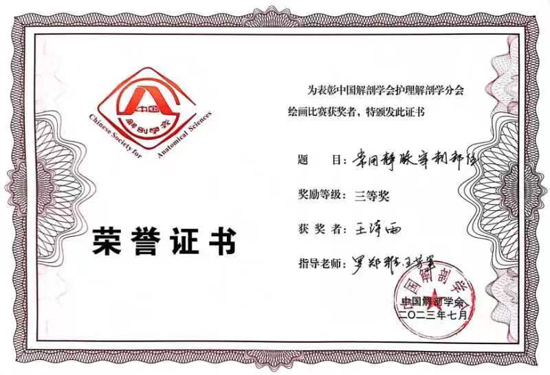 本网讯(通讯员 邓丽 赵红深)7月14日—17日,由中国解剖学会护理分会主办,南京大学医学院承办的第十八届护理解剖学年会在南京大学国际会议中心隆重举行,会议对第五届全国医学生解剖学绘图大赛进行了表彰。beat365医学技术与护理学院护理学本科1902班宋雨同学的作品《弹指》获二等奖,护理专科2201班王诗雨同学的作品《常用静脉穿刺部位》获三等奖。可喜可贺。