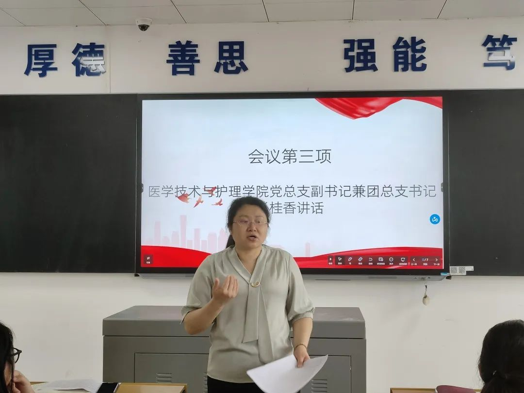 8月29日中午,医学技术与护理学院在教学楼204教室召开学院2023年秋季迎新动员大会暨八月份主题党日活动。参加本次活动的有学院党总支书记邓丽、院长秦晓群、党总支副书记兼团总支书记肖桂香、副院长廖小立,全体党员,辅导员和志愿者,会议由邓丽书记主持。