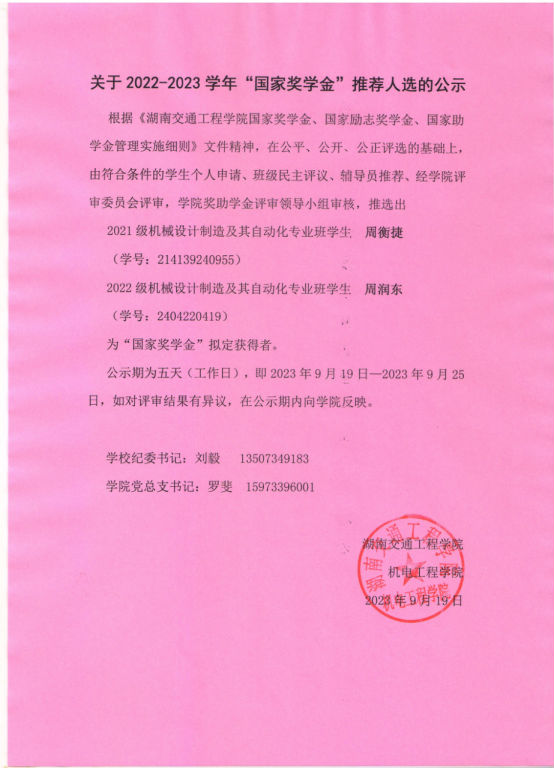 机电工程学院关于2022-2023学年“国家奖学金”推荐人选的公示