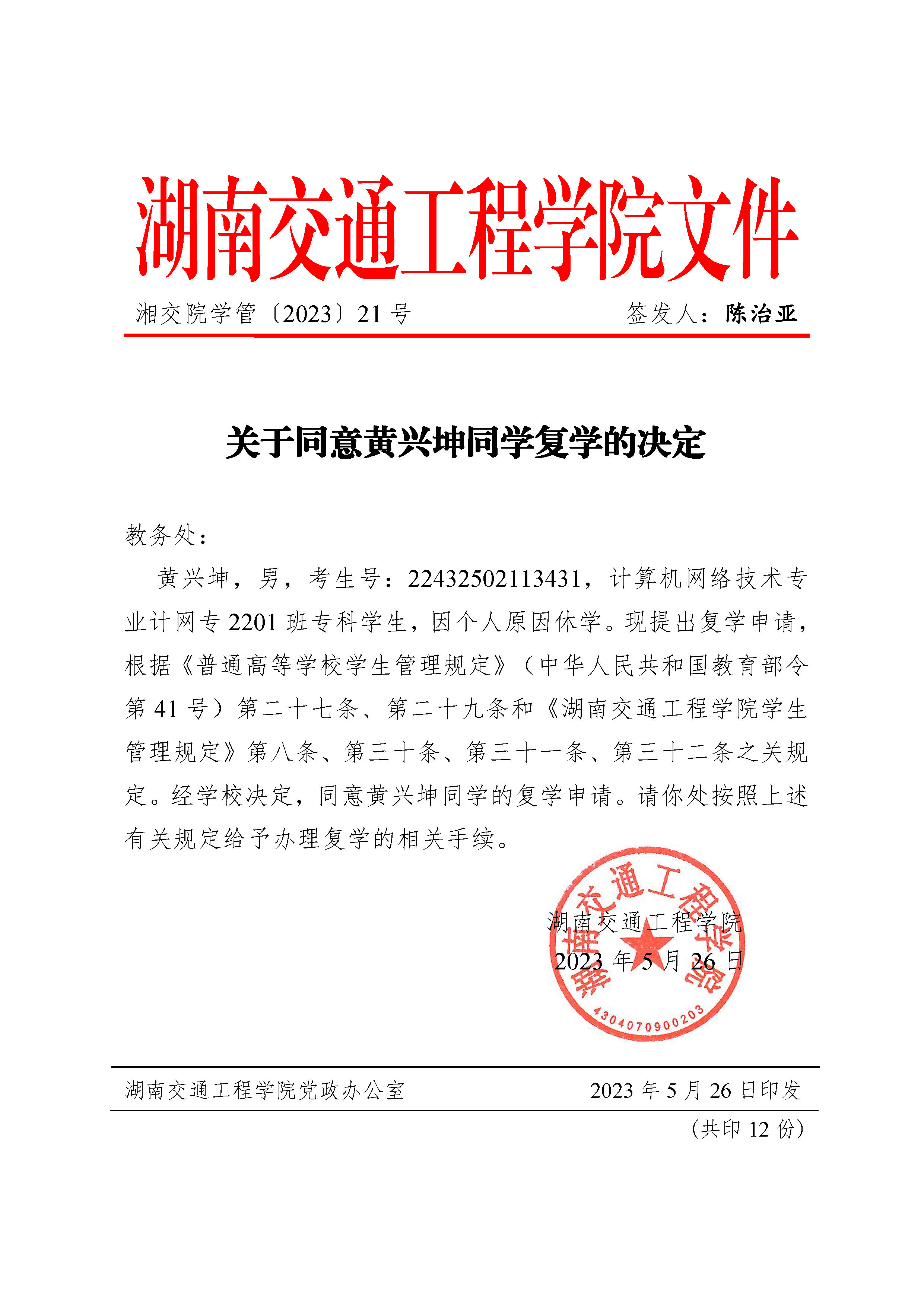 关于同意黄兴坤同学复学的决定(湘交院学管〔2023〕21号)