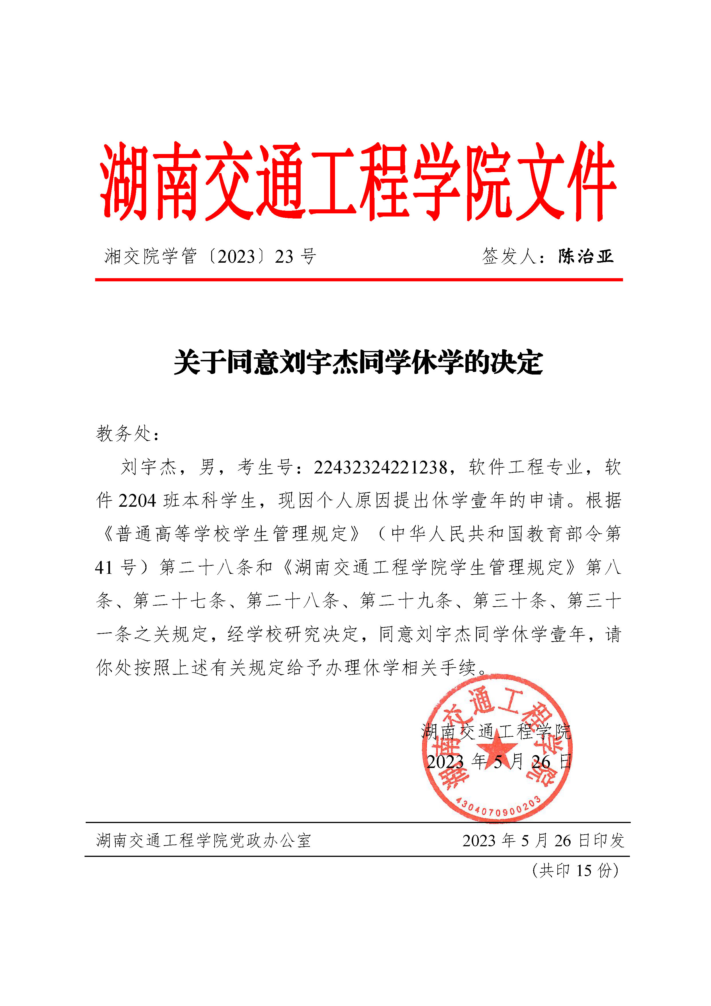关于同意刘宇杰同学休学的决定(湘交院学管〔2023〕23号)
