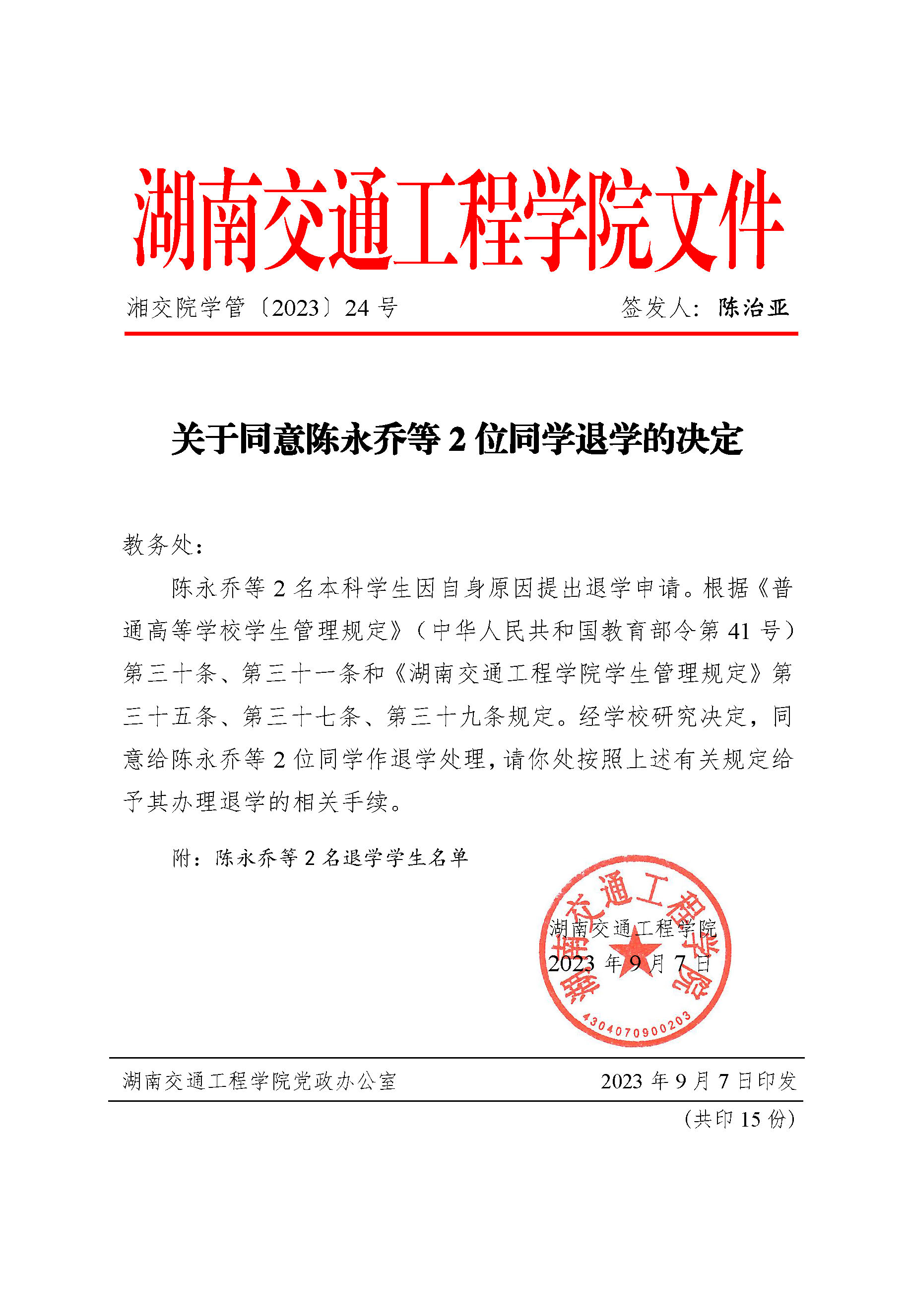 关于同意陈永乔等2位同学退学的决定(湘交院学管〔2023〕24号)