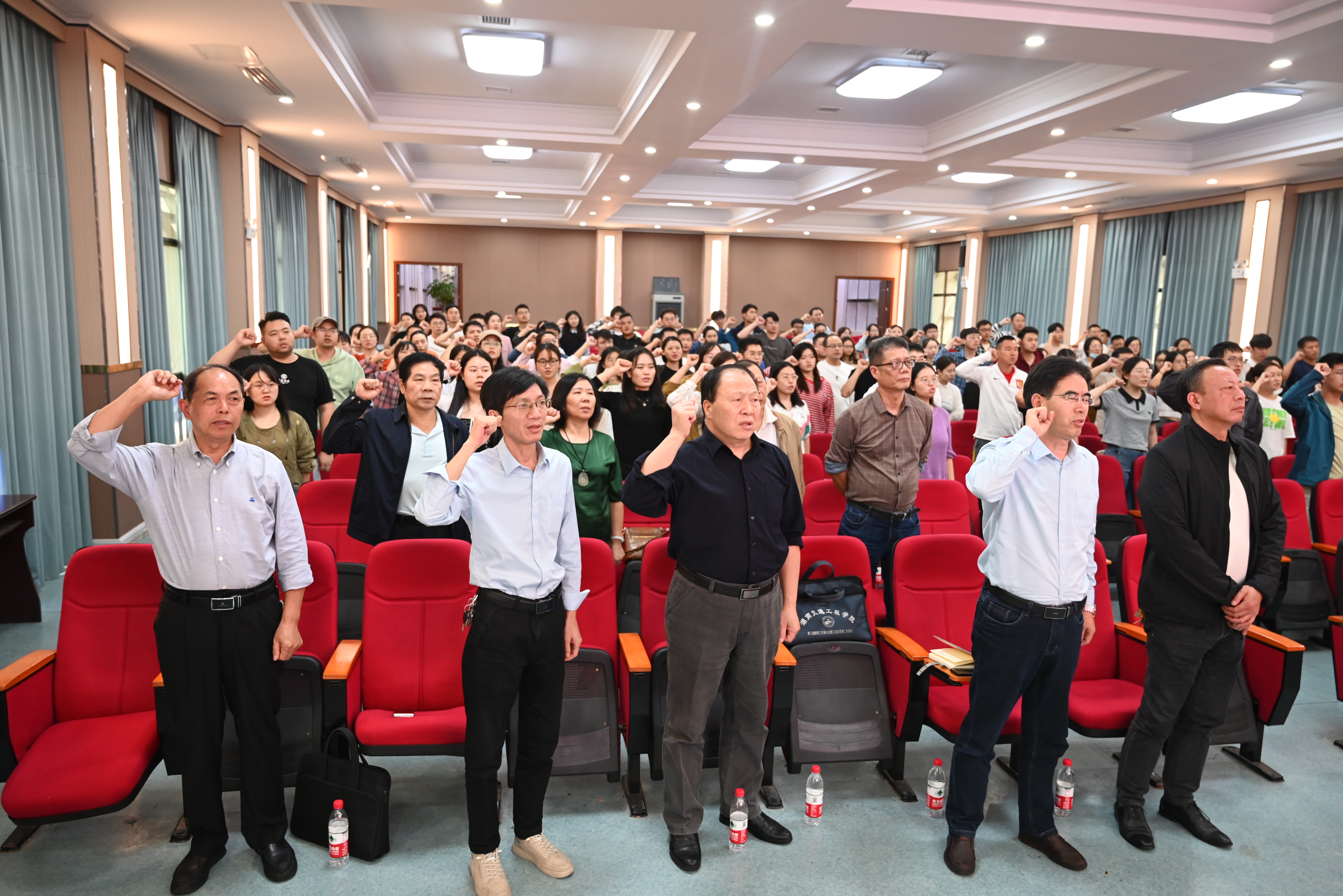 全体新入职教师集体宣誓,校党委副书记、副校长冯良贵领读《教师誓词》。