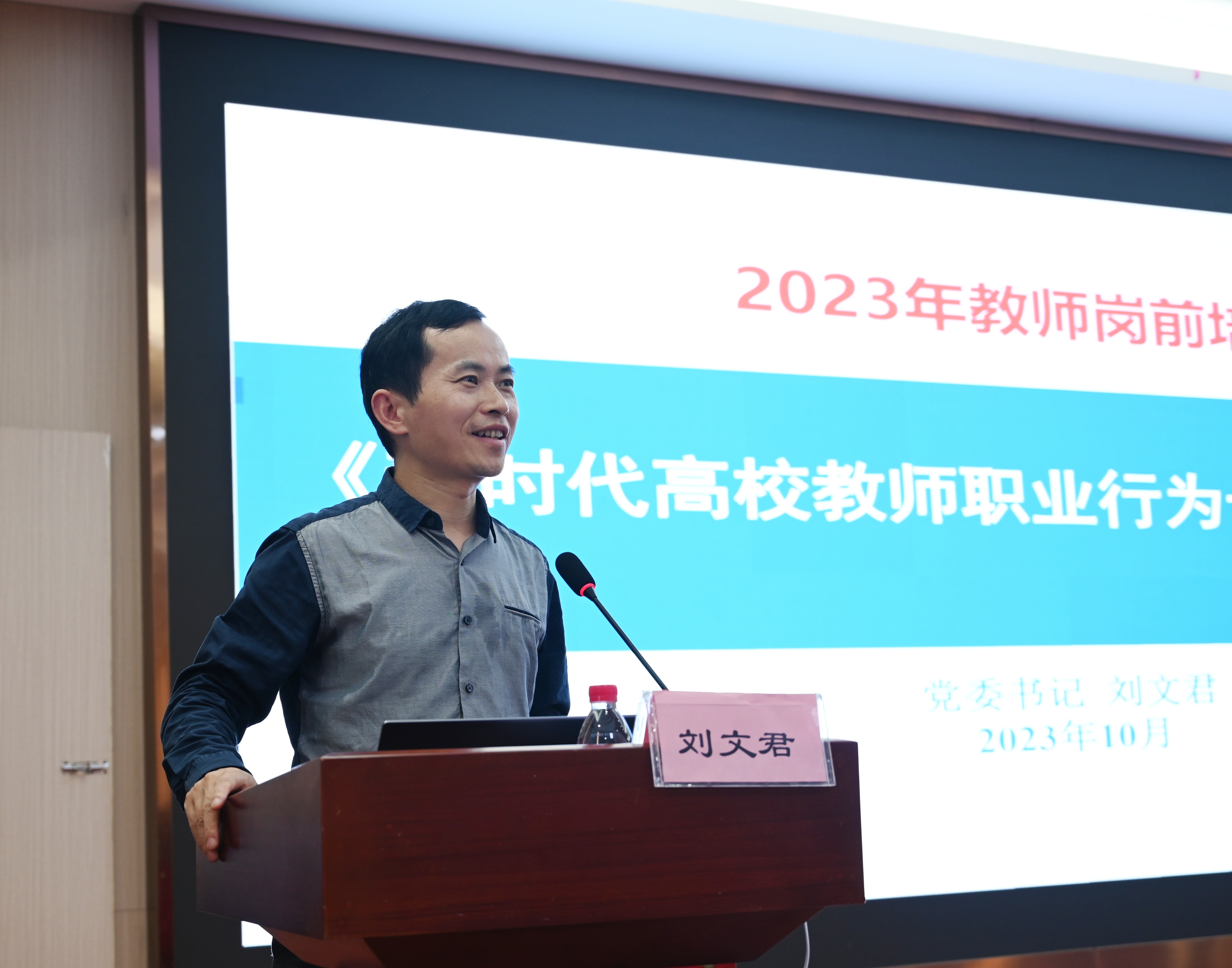 开班典礼结束后,刘文君以“《新时代高校教师职业行为十项准则》解读”为题为培训班主讲了第一课。他从不同侧面丝丝如扣,深入浅出解读了《准则》的出台背景、重要意义、制定过程、主要内容和《准则》的落实情况等,让大家如沐春风,深受启迪。(审核:刘文君)