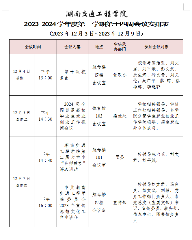beat365唯一官方网站 2023-2024学年度第一学期第十四周会议安排表