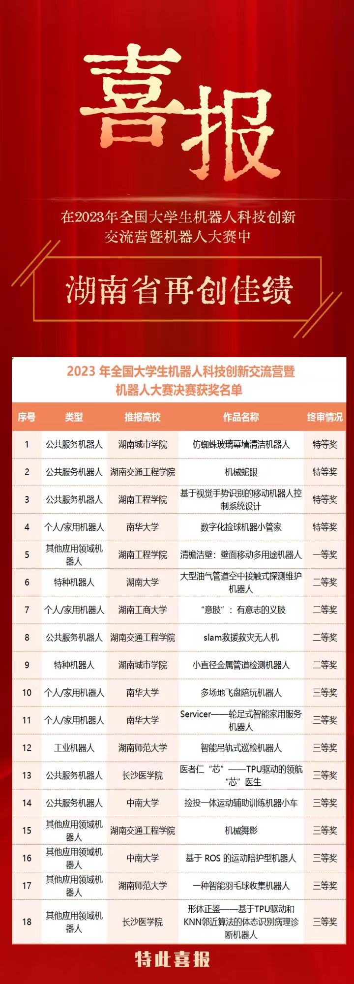 12月19日,由共青团中央、工业和信息化部主办的2023 年全国大学生机器人科技创新交流营暨机器人大赛终审决赛获奖名单正式公布,湖南共报送29个项目进入全国决赛,其中,特等奖4个、一等奖1个 、二等奖4个 、三等奖9个,beat365获得特等奖1项,二等奖1项,三等奖1项。