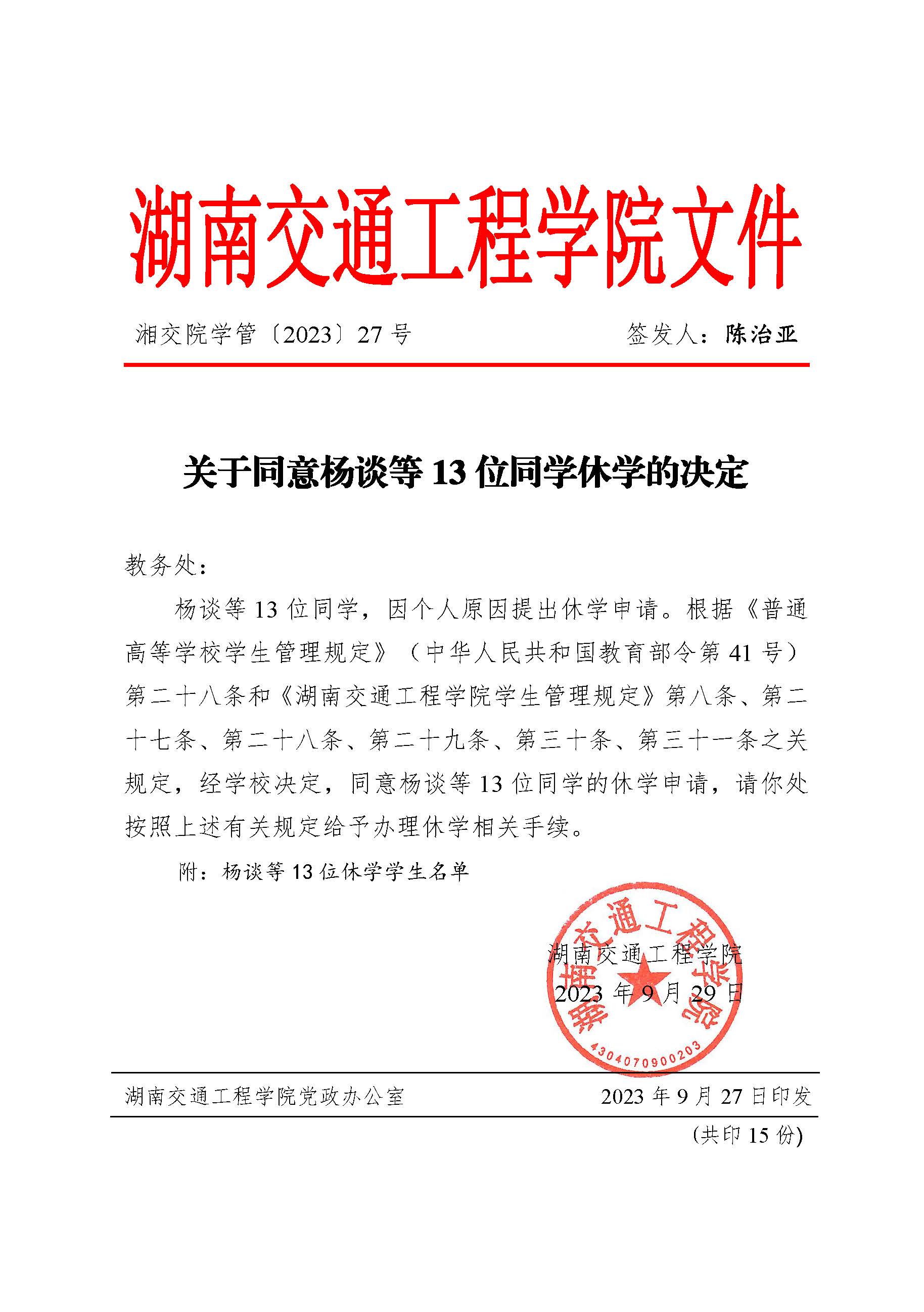 关于同意杨谈等13位同学休学的决定(湘交院学管〔2023〕27号)
