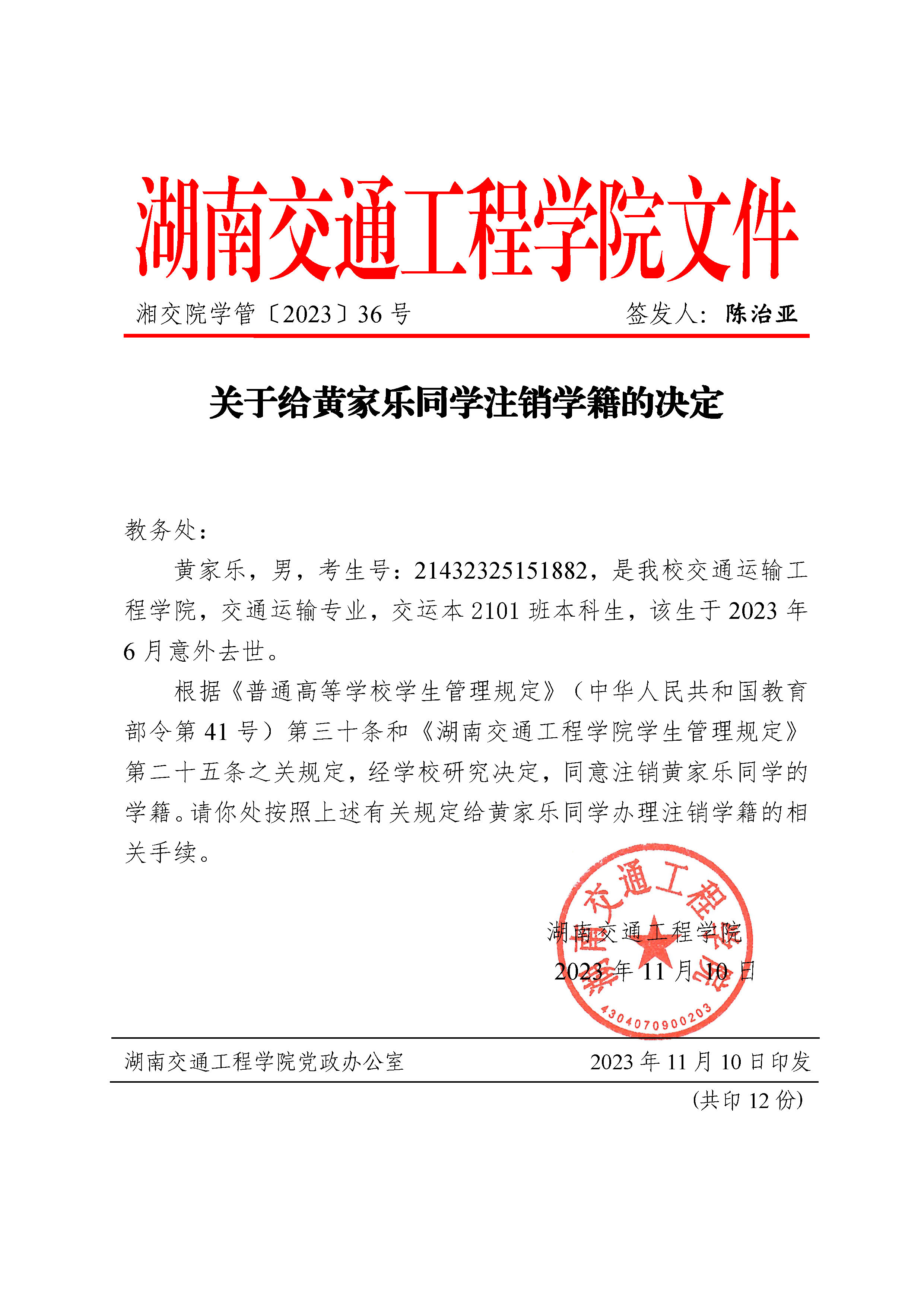 关于给黄家乐同学注销学籍的决定(湘交院学管〔2023〕36号)