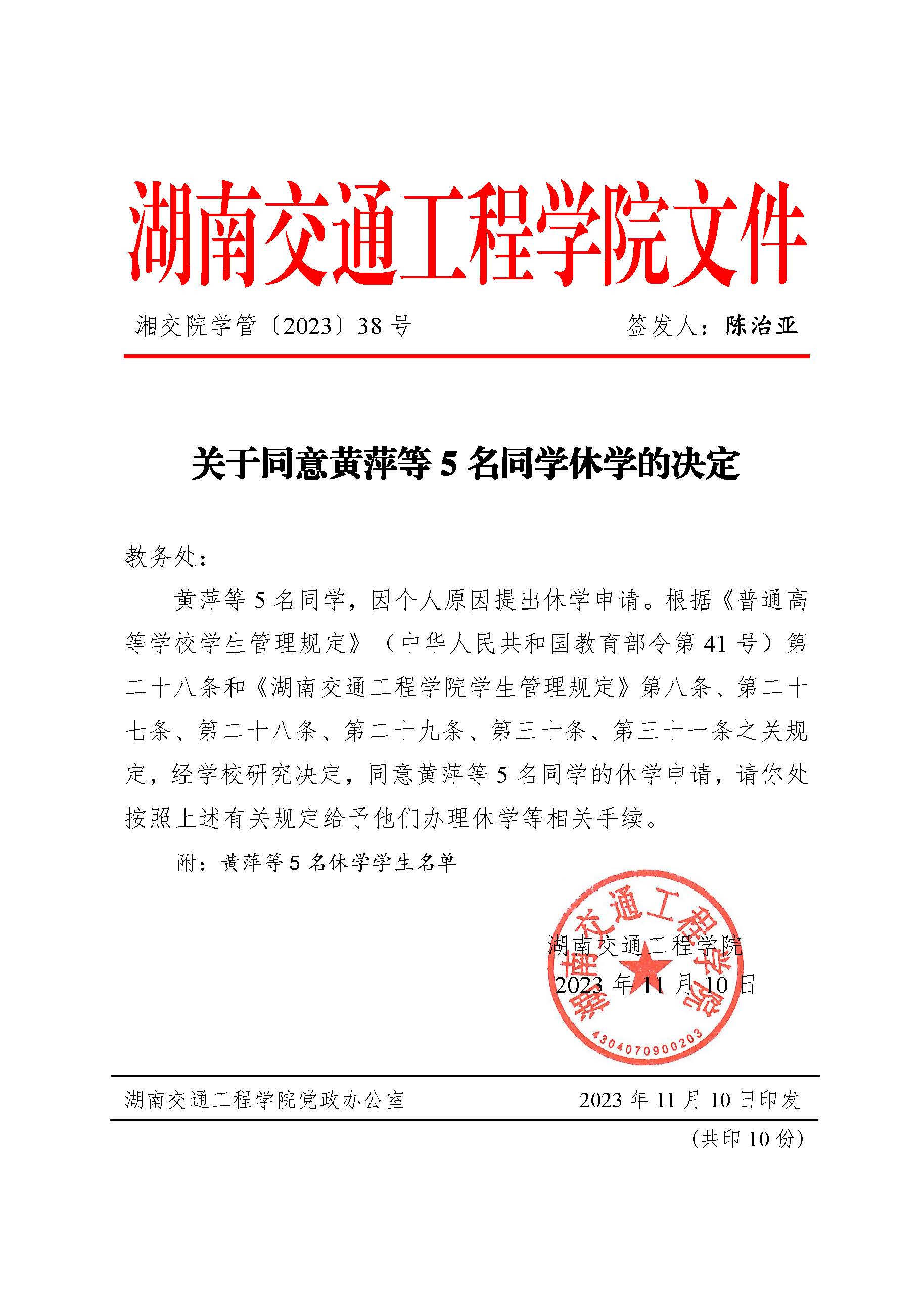 关于同意黄萍等5名同学休学的决定(湘交院学管〔2023〕38号)