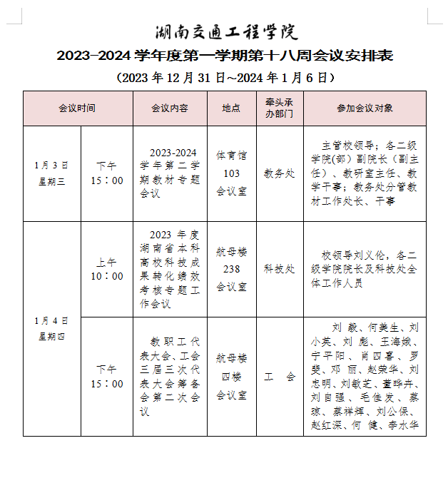 beat365唯一官方网站2023-2024学年度第一学期第十八周会议安排表