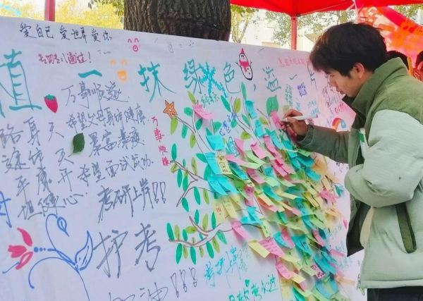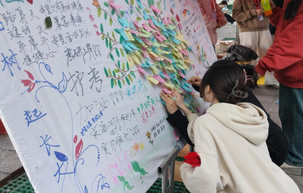 活动现场,在志愿者的有序组织下,同学们积极参与到了创意涂鸦的过程中来,用所提供的颜料和画笔,将自己的想法汇入到了同一棵“大树”,也将自己对于这次活动的感受和未来的愿望写在了便利贴上,文字与涂鸦的巧妙融合构成了一棵枝繁叶茂的大树。