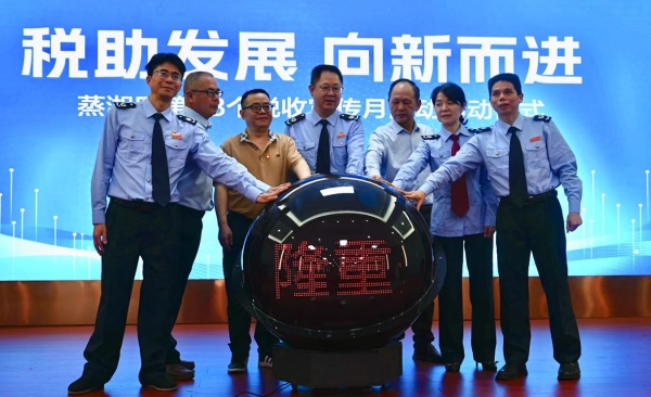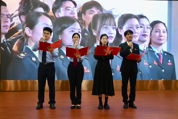 接着,大家观看了税务宣传片。4名税务干部的诗歌朗诵《中国税务赋》,使会场气氛更加热烈,现场传来阵阵掌声。