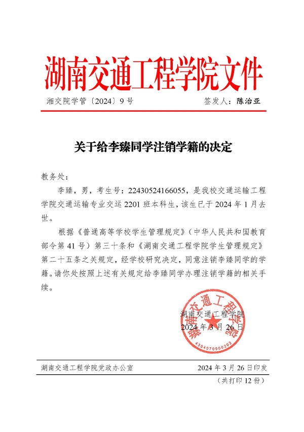 关于给李臻同学注销学籍的决定(湘交院学管〔2024〕9号)
