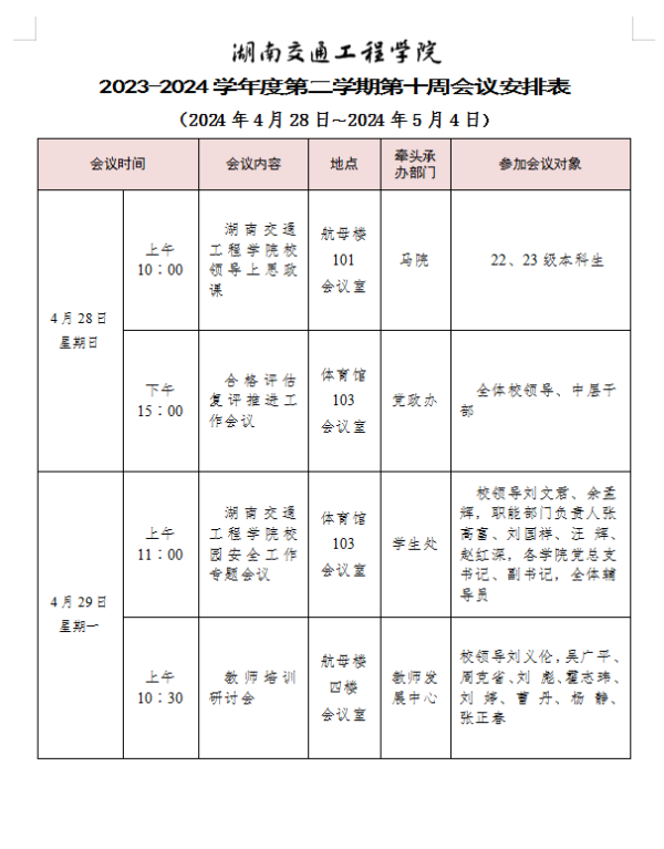 beat365唯一官方网站2023-2024学年度第二学期第十一周会议安排表