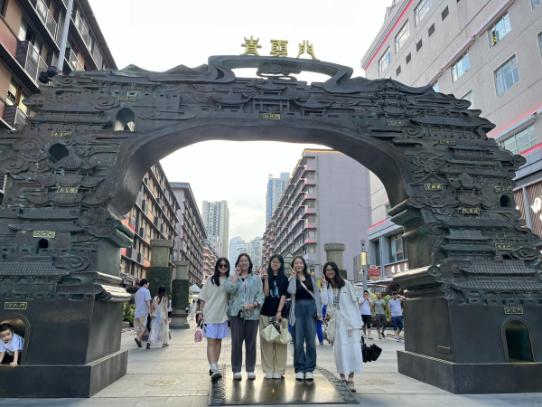 5位学生在青云市集门口合影