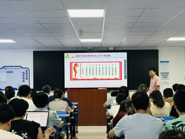罗斐书记通过PPT形式围绕党的二十大报告中强调的要“建设具有强大凝聚力和引领力的社会主义意识形态”,“意识形态工作是为国家立心、为民族立魂的工作”,要“牢牢掌握党对意识形态工作领导权,全面落实意识形态工作责任制,巩固壮大奋进新时代的主流思想舆论”以及习近平总书记关于“教育家精神”的重要论述、《中华人民共和国教师法》、《教师资格条例》、新时代教师职业行为十项准则、《关于加强和改进新时代师德师风建设的意见》、教育部公开曝光违反教师职业行为七起典型案例等方面进行了讲解。并对《机电工程学院意识形态工作责任制实施办法》进行了解读。