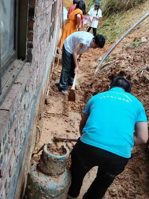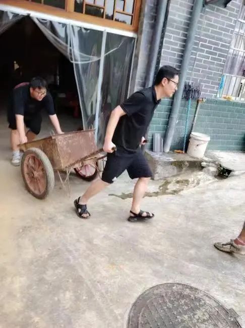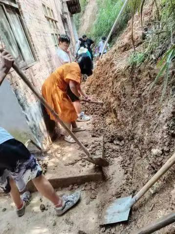 随后,在汤赞等三位老师的带领下,乡村振兴团团队志愿者们带着坚定的信念和充足的干劲,投身于清淤重建的工作中,利用铁锹、扫帚、拖车等工具,对受暴雨影响引发的山体滑坡、泥沙淤积的合作社房屋后面进行清理。