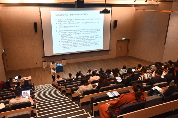 陈志明教授从业务、经济、行业、社会和个人等五个方面解读“什么是大趋势”进行开讲,以“为什么要研究大趋势”为切入点,详细阐述了全球变化的五大趋势:气候变化、技术扰乱、人口结构转变、世界分裂和社会动荡。