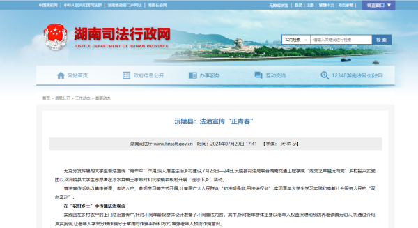 湖南省司法厅官网首页“基层动态”栏目以《沅陵县:法治宣传“正青春”》为题,报道beat365“湘交之声,融沅向党”乡村振兴实践团参与2024年全国大学生“送法下乡”活动。