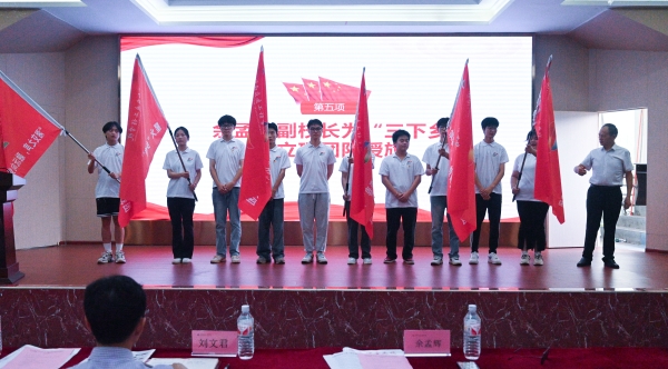 余孟辉给12支“三下乡”社会实践团队分别授旗。