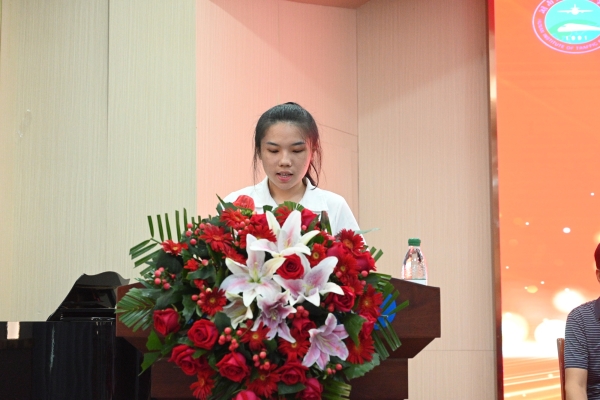 经济管理学院国贸2201班邓捷文代表学生发言,她向所有孜孜不倦辛勤耕耘在教学一线的老师们致以崇高的敬意和感谢。作为当今大学生,我们能回报你们的就是牢记你们的教育,努力拼搏,奋勉向上,认真踏实的学好你们教给我们的学问和技能。使自己成为有益于社会、服务于社会、奉献于社会的高素养应用型人才。