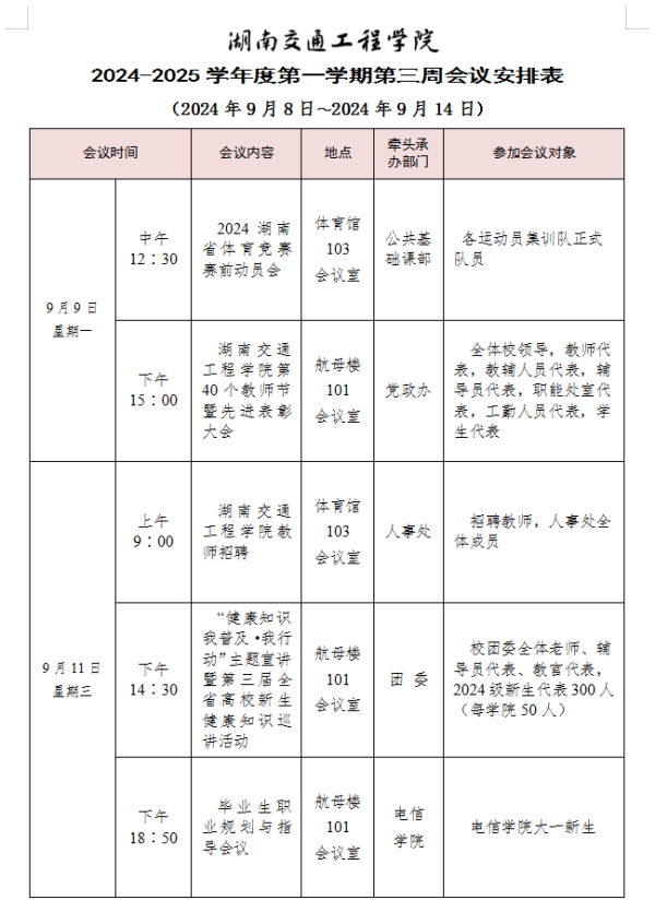 beat365唯一官方网站2024-2025学年度第一学期第三周会议安排表