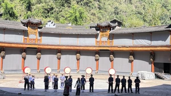 全体师生首先汇聚在德夯苗寨广场,欣赏了一场精彩纷呈的德夯苗鼓表演。德夯苗寨人人善于击鼓,有“天下鼓乡”之美誉,每年这里都要举办鼓文化节,全国各地的鼓队抵达德夯参赛,打得最好的被尊奉为鼓王。德夯苗族鼓乐最具有舞蹈特色,是音乐、舞蹈的完美结合。德夯苗鼓舞通过叙事性的表演方式,构成了湘西苗族鼓乐的独特个性,它通过一个个生动的舞蹈动作,再现了湘西苗族人民生活、劳动的场景,展现了精彩纷呈的湘西苗族历史画卷。苗族舞者们用优美的舞姿和流畅的动作展示了民族舞蹈的魅力,学生们无不为其独特的艺术表现形式所吸引。这不仅是一次艺术的享受,也是一次深刻的文化体验,让大家对苗族文化有了更直观的认识。在德夯苗寨鼓师的精心指导下,采风学生现场学习苗族鼓舞,从开始的不熟练到逐渐掌握节奏的规律,最终能够整齐划一地击打出苗鼓特有的韵律。这种通过肢体与声音融合的表现方式,不仅让学生们体会到了苗鼓的力量感,也增强了他们对节奏和音乐表达的理解。