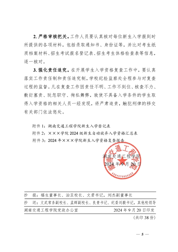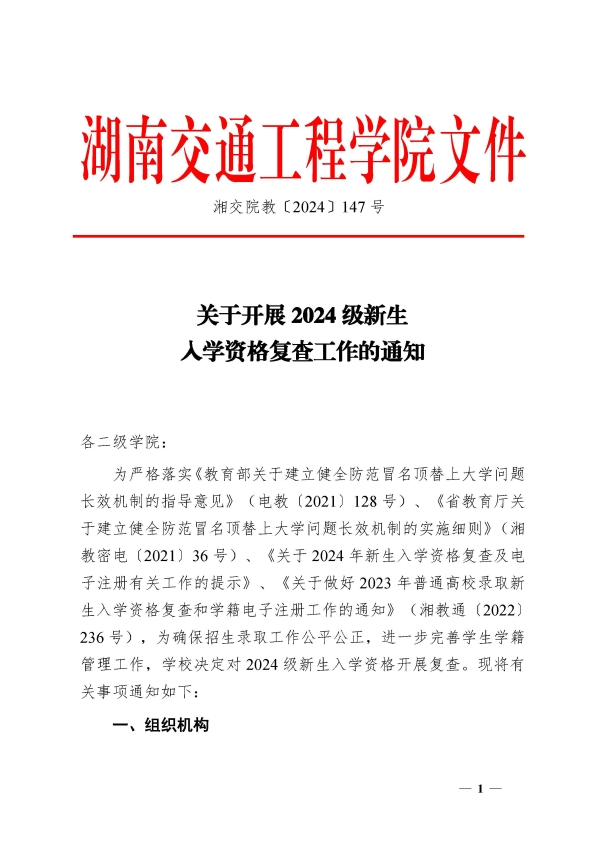 关于开展2024级新生入学资格复查工作的通知(湘交院教〔2024〕147号)