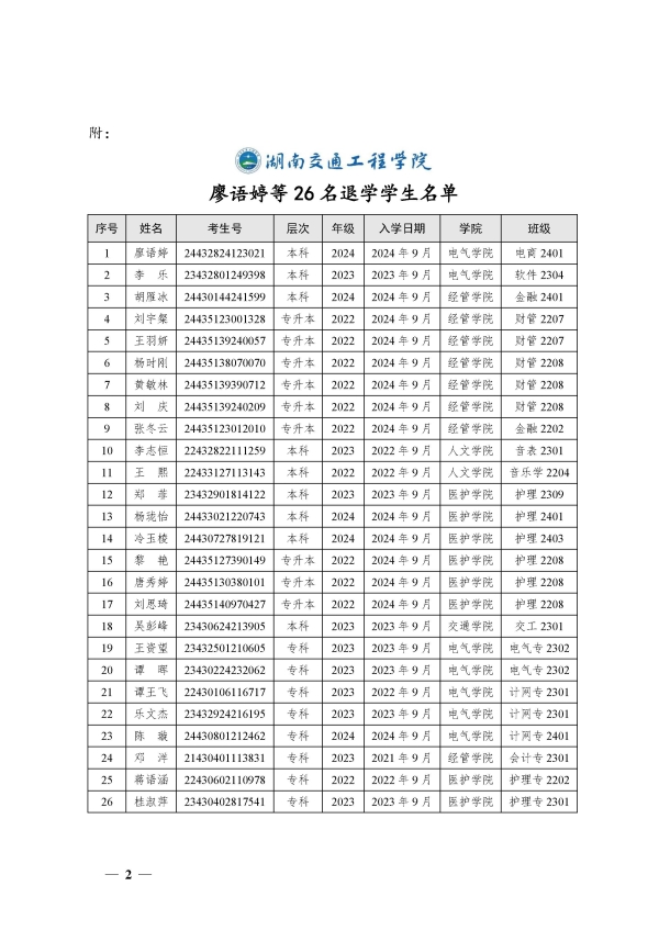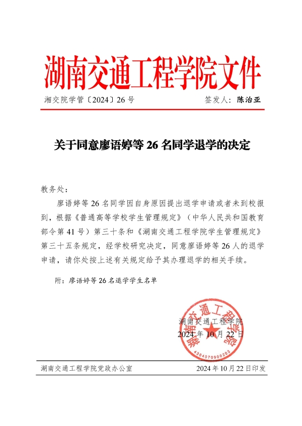 关于同意廖语婷等26名同学退学的决定(湘交院学管〔2024〕26号)