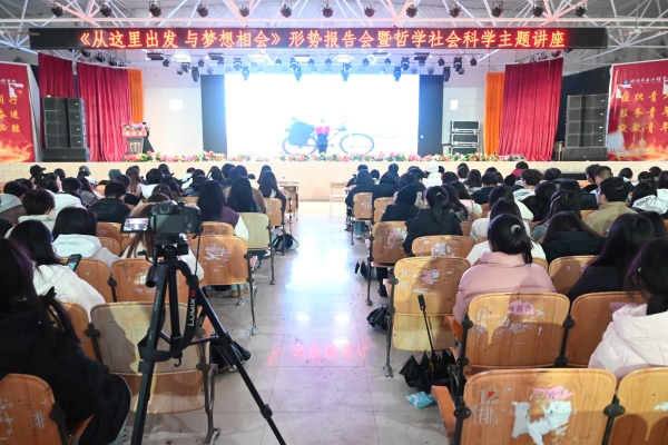 本网讯(通讯员 摄影 赵红深)为引导大学生树立正确的人生观与价值观,培养坚韧品质与奋斗精神,12月5日下午,学校在大学生活动中心举行《从这里出发,与梦想相会》报告会暨哲学社会科学主题报告会,邀请弘扬中国系列-故事巡讲嘉宾龙永康先生作2024年《骑车去埃及》励志报告。校图书馆长张海兵主持,1200多名学生参加报告会。