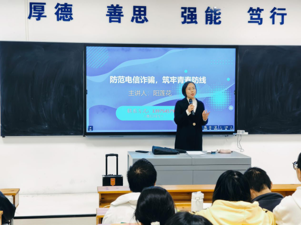 阳莲花律师就校园网络诈骗、个人隐私保护、校园日常学习生活及就业陷阱等青少年常遇到的法律问题,从电信诈骗的定义出发,用令人气愤又惋惜的徐玉玉电信诈骗案让同学们熟悉并警惕电信诈骗通过测试防诈意识与同学们交流互动,运用生动灵活的方式使同学们轻松了解了更多防诈知识,对大学生活中的常用诈骗手段拉起警报线阳莲花律师通过反诈八问,四不要等耐心告知同学们如何增强防范意识。