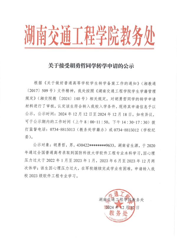 关于接受胡勇哲同学转学的公示