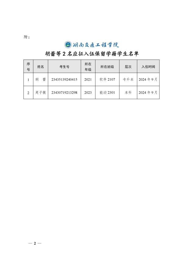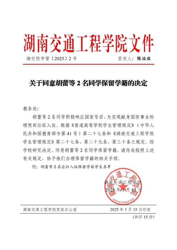 关于同意胡蕾等2名同学保留学籍的决定(湘交院学管〔2025〕2号)