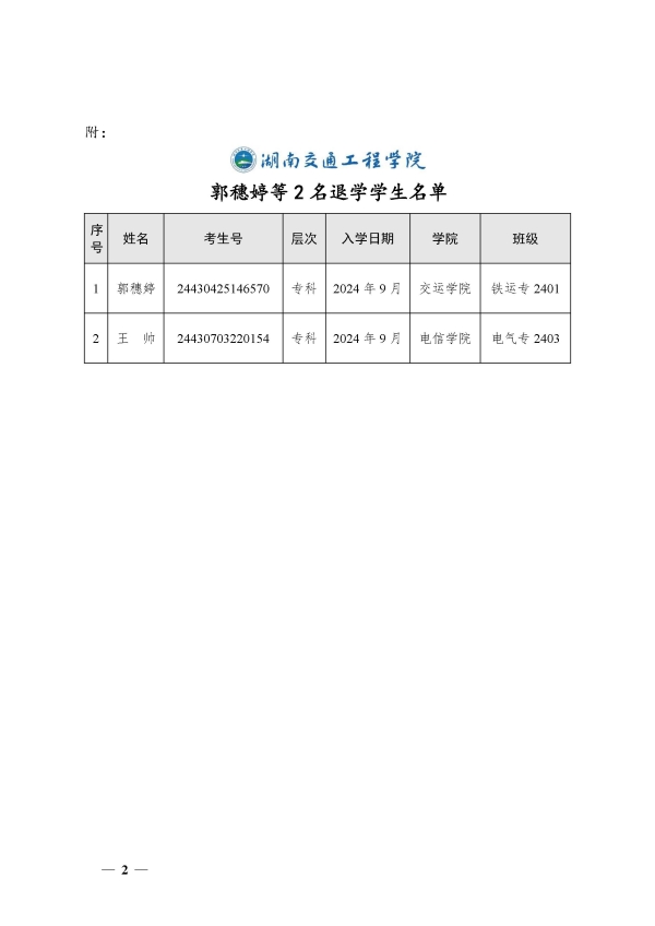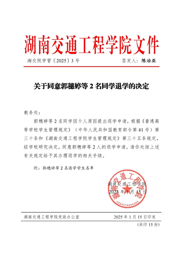 关于同意郭穗婷等2名同学退学的决定(湘交院学管〔2025〕3号)