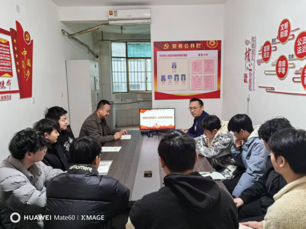 首先,党总支书记何美生以“以党建引领育新人,五育并举促发展”为主题,为全体人员上了一堂深刻的党课。他在课上指出,党建引领是新时代教育工作的核心,必须将党建工作与育人工作紧密结合,充分发挥党组织的战斗堡垒作用和党员的先锋模范作用,其中特别强调了“党建进宿舍”的重要性。指出宿舍是学生日常生活和学习的重要场所,也是思想政治教育工作的重要阵地。通过推动党建活动深入宿舍,可以让党的先进理念和精神在学生生活中落地生根,为宿舍文化建设注入强大动力。他要求全体成员积极行动,将党建工作与宿舍管理紧密结合,推动“五进宿舍”工作落实到位,营造积极向上的宿舍氛围,助力学生全面发展。