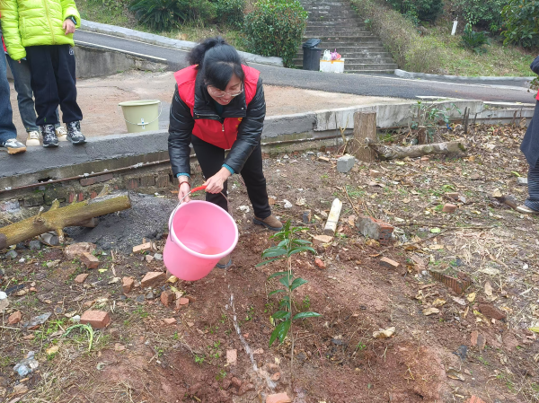 活动当天,身穿红马甲的志愿者们热情高涨,他们纷纷拿起铁锹、水桶、花艺剪刀等工具,以饱满的热情投入到植树行动中。大家分工协作,三五一组,有的挥锹铲土,有的扶苗填坑,有的提水浇灌,还有的则负责填埋土壤,他们细心地将土压实,确保树苗能够稳固生长。每一个环节都认真细致,配合默契,力求将每一棵树苗都栽种得稳稳当当。通过志愿者们的共同努力,一株株新栽的树苗迎风挺立,为校园的这片土地增添了勃勃生机。