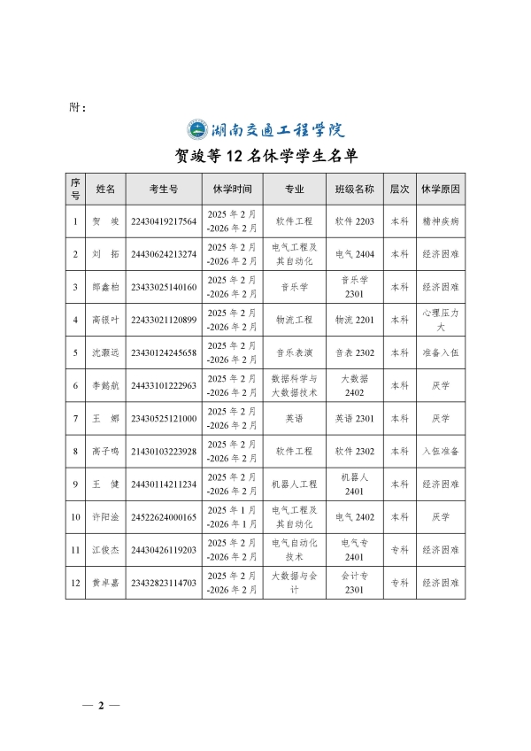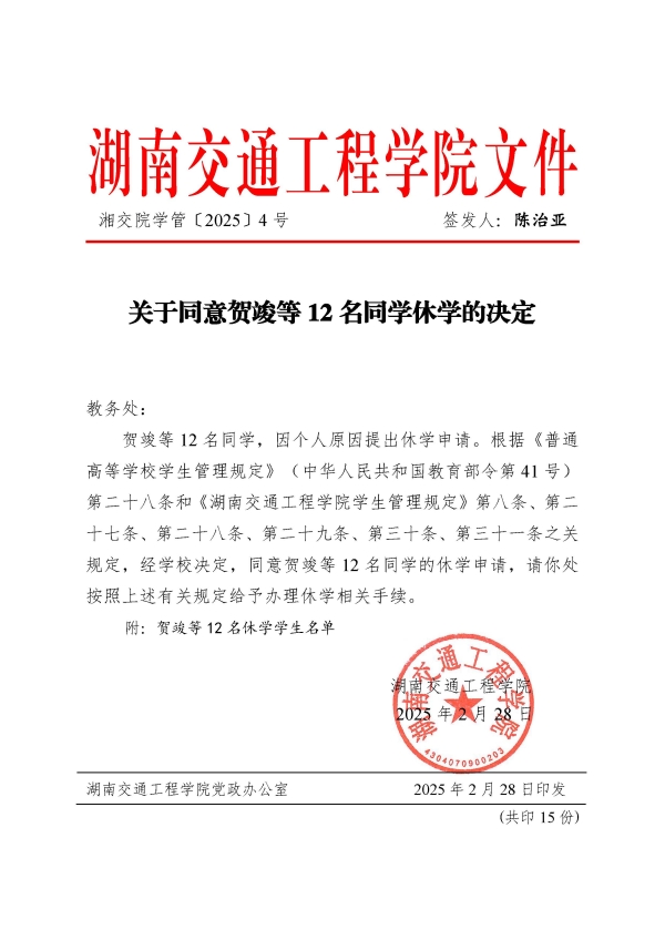 关于同意贺竣等11名同学休学的决定(湘交院学管〔2025〕4号)