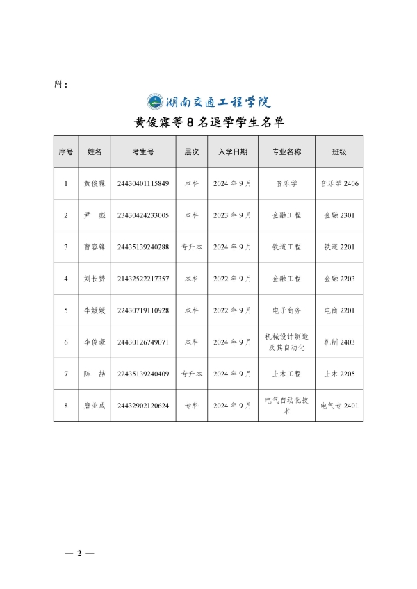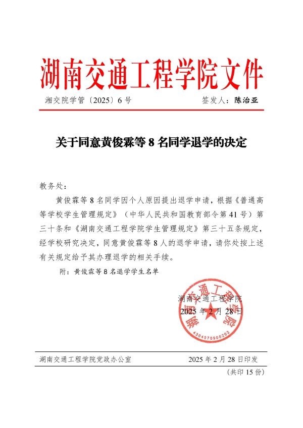 关于同意黄俊霖等8名同学退学的决定(湘交院学管〔2025〕6号)