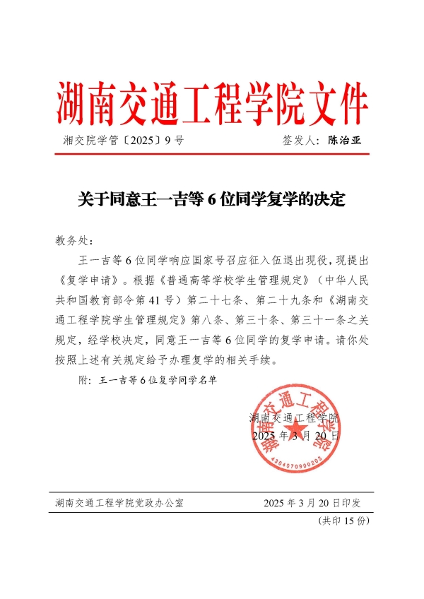 关于同意王一吉等6位同学复学的决定(湘交院学管〔2025〕9号)