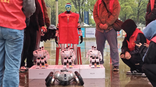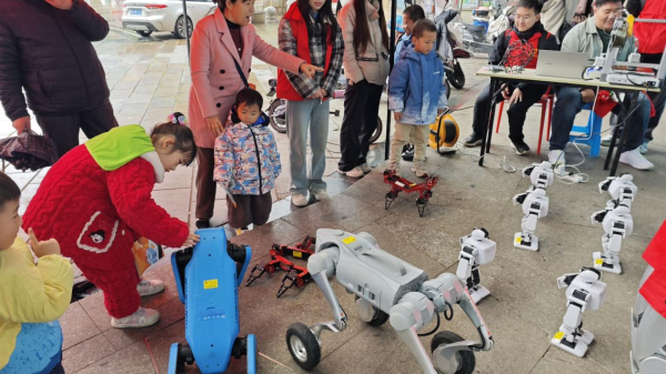 在科技创新展区,学生团队携“智能垃圾分类助手”“模块化太阳能充电器”等12项原创作品亮相。其中,“再生材料3D打印工坊”吸引近百名居民驻足,通过废旧塑料再生为耗材的全流程演示,直观展现环保科技魅力;乐聚人形机器人编队以毫米级同步精度演绎科技舞蹈,宇树四足机械狗灵活翻越障碍,现场观众争相体验平板操控机械狗穿越障碍的乐趣。