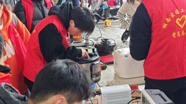 活动现场,党员师生组成“红匠维修队”,设立“一站式家电维修服务站”,为居民提供电饭煲、空调、洗衣机等20余类家电的故障排查与维修服务。通过“登记-诊断-维修-反馈”标准化流程,学生党员引导居民有序参与,教师党员带队开展“初检+复检”双重故障诊断,并增设“透明化操作台”同步讲解家电保养知识。针对复杂故障,团队通过“云端支持系统”实时连线学院实验室,由专家远程指导解决方案,现场利用3D打印机制作非标配件。