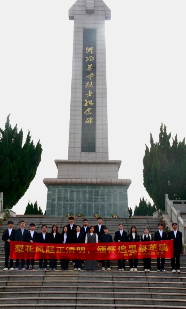 2025 年4 月3 日下午三点,机电工程学院开展“缅怀革命先烈,弘扬民族精神”清明节祭扫活动。本次活动由机电工程学院党总支副书记、团总支书记辛敬凤带领何立权老师、刘晓珍老师,两会一中心学生干部,来到衡阳市烈士陵园,开启了一场触动心灵的致敬英烈之行。