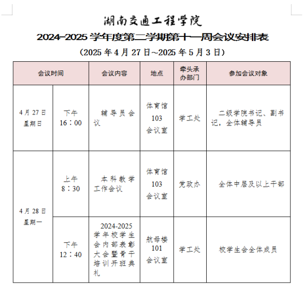 beat365唯一官方网站2024-2025学年度第二学期第十一周会议安排表
