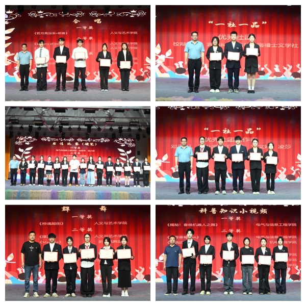 晚会现场举行隆重颁奖仪式,表彰在社团文化建设中表现突出的集体与个人:人文与艺术学院、经济管理学院、医学技术与护理学院获“优秀组织奖”;校辩论队、奔跑Bar电竞社、南禮士文学社获评“一社一品”优秀社团;李水华等9位教师被授予“优秀指导老师”称号,邓周阳等25名学生获“优秀社团工作者”表彰。校领导为获奖者颁奖时强调,希望全校师生以榜样为标杆,在文化传承创新中勇担时代使命。